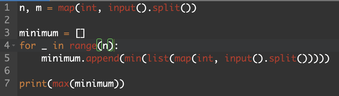 그리고 최종적으로는 그 최솟값 중에서 가장 큰 수를 출력하면 되므로 max() 함수를 이용해서 최솟값 중에서 가장 큰 최댓값을 출력시키도록 코드를 작성하면 해결할 수 있다.