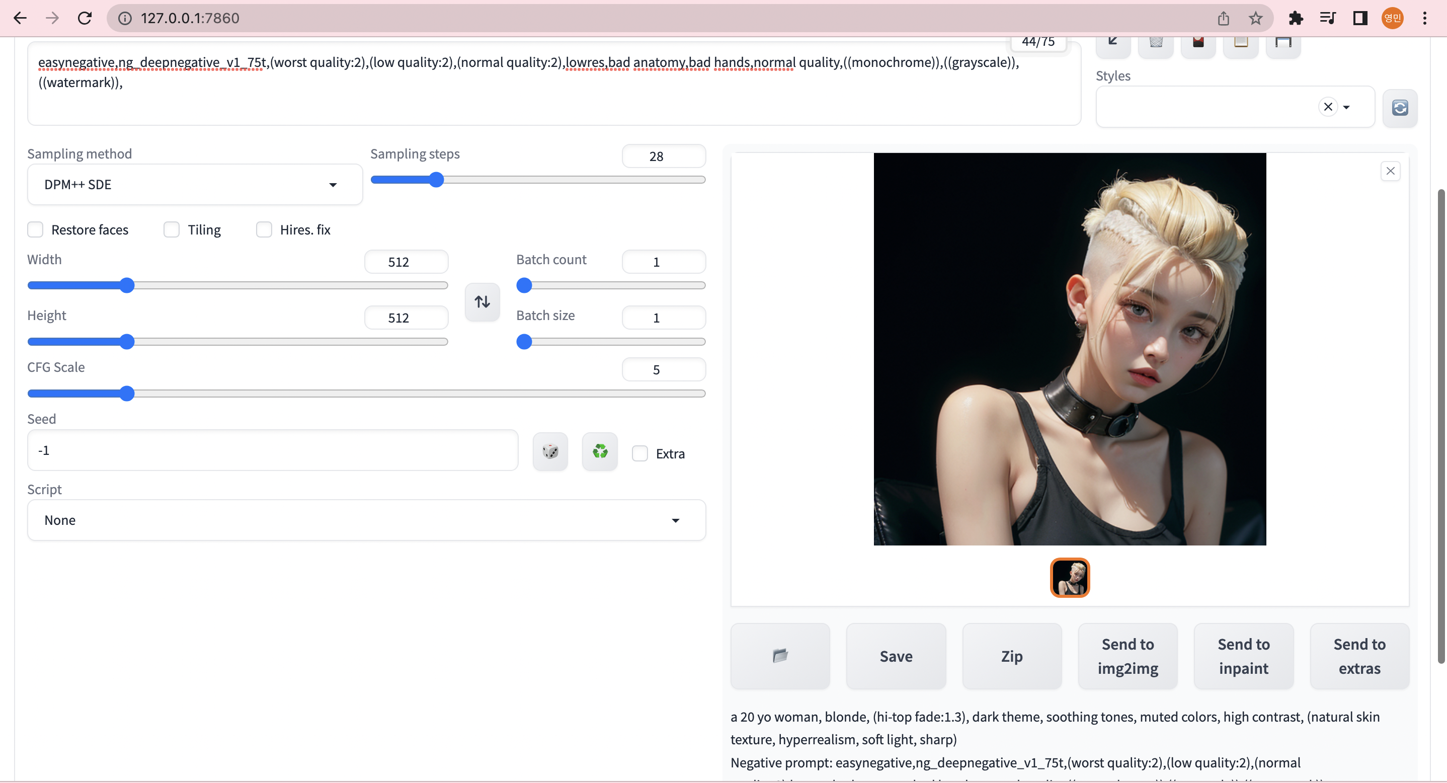 그리고 홈페이지에 있는 이미지 하단에 있는 느낌표 버튼을 눌러서 프롬프트 정보와 네거티브 프롬프트, 샘플러 정보 등을 stable diffusion web에 맞춰 입력하고 Generate를 누르고 기다리면 이미지가 생성된다.