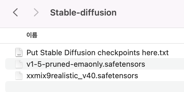 링크에 접속해서 Download 버튼을 누르면 safetensors 확장자를 가진 파일이 다운로드 된다. 다운로드가 끝나면 아래와 같이 stable-diffusion-webui가 설치된 경로의 models/Stable-diffusion 폴더에 해당 파일을 옮긴다.