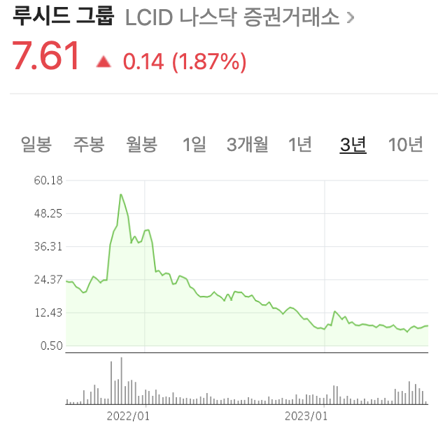 위 그래프의 주인공은 테슬라와 함께 엄청난 전기차 주식 붐을 일으키며 한때 50$ 부근까지 올랐던 '루시드 그룹(LCID)'이다.