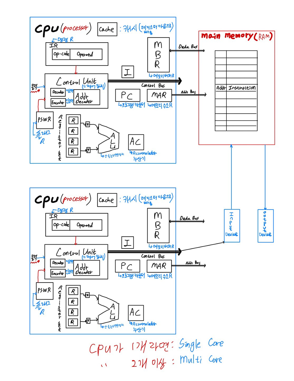 · MBR(메모리 버퍼(데이터) 레지스터): 데이터&명령어가 잠시 기억되는 레지스터
