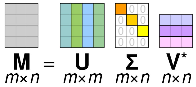쉽게 설명하면 어떤 행렬이 주어지면 그 행렬은 U * S * VT로 분해할 수 있다는 것이고 이때 가운데에 있는 S는 항상 대각성분만 숫자고 나머지는 0인 행렬이 된다는 것이다.
