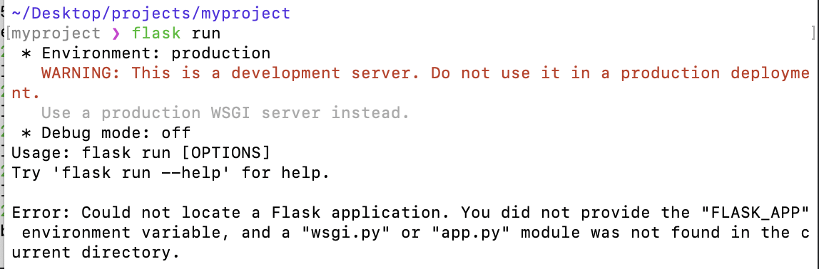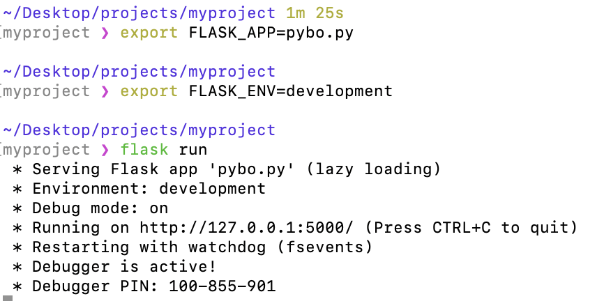 책에서는 set FLASK_APP=pybo와 set FLASK_ENV=development를 입력하라고 한다. 하지만 맥에서는 아래와 같이 export를 앞에 붙여주고 입력해야 한다.