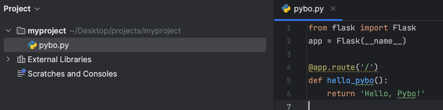 ~/Desktop/projects/myproject 위치에 파이참으로 pybo.py를 만들고 아래와 같은 코드를 입력하자.