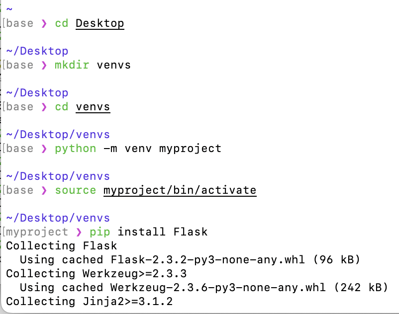 먼저 바탕화면에 venvs라는 디렉터리를 하나 생성하고 'python -m venv myproject'를 입력해 가상 환경을 만들어 준다.