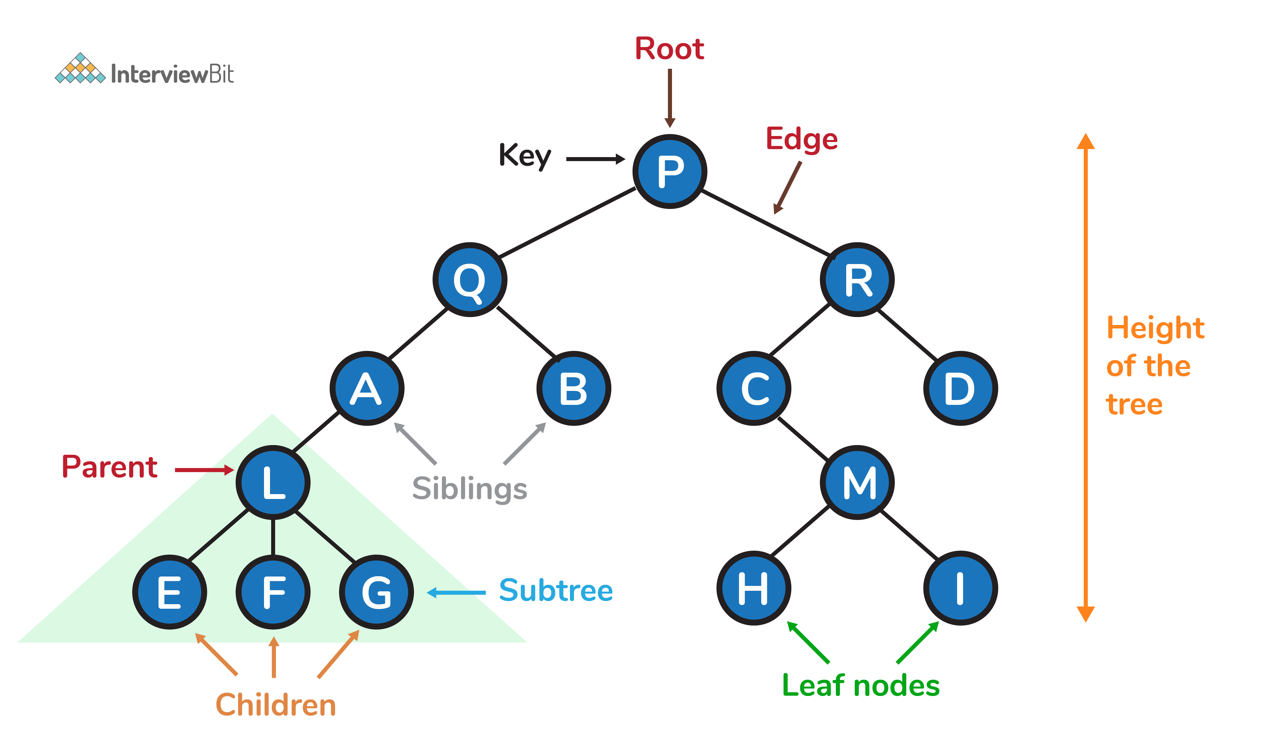 - 자식을 가진 노드 → 위 그림에서 P는 Q와 R의 부모 노드, L은 E, F, G의 부모 노드