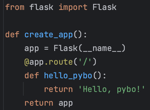 위 코드를 보면 create_app() 함수 안에 hello_pybo() 함수가 들어 있다. 이 함수는 URL 에서 /에 매핑되는 함수인데, 그 매핑을 @app.route('/')라는 어노테이션(annotation)이 만들어 준다.