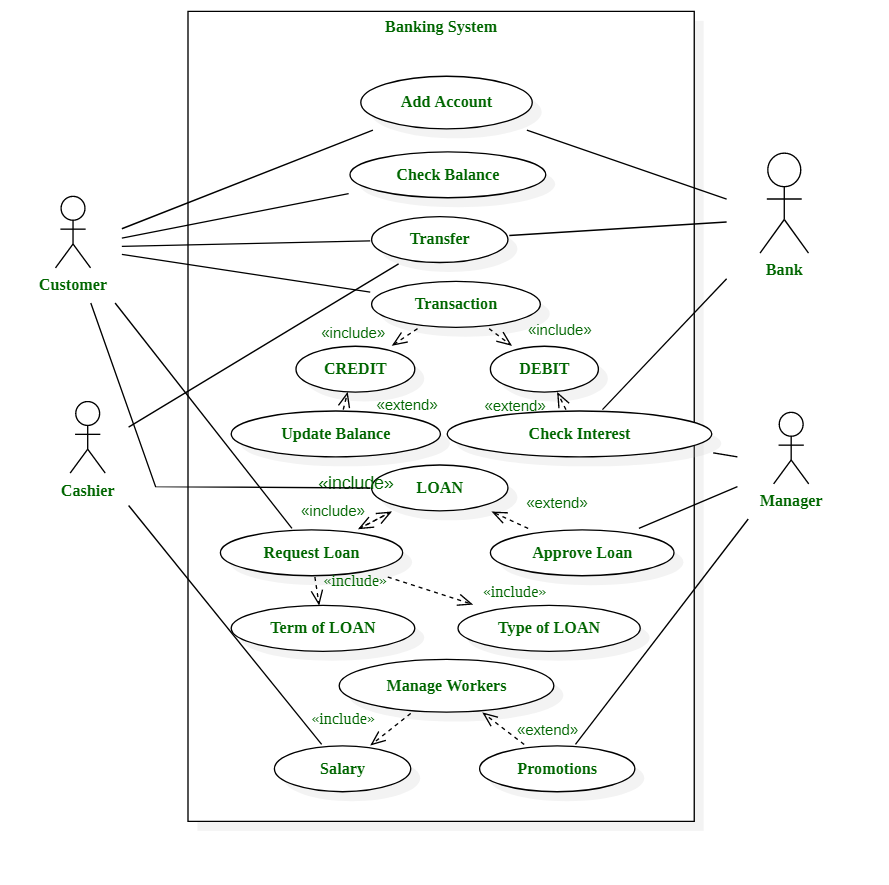 먼저 시스템은 직사각형으로 그려지고 가장 상단 중간에 시스템명을 작성한다. 따라서 위 그림에서 직사각형의 중앙 상단을 보면 'Banking System'이라고 되어 있는 것을 확인할 수 있다. 다음으로, 액터를 찾는데 위 예시에서는 고객, 직원, 은행, 관리자를 액터로 두었다. 다음으로 유스케이스를 찾아 각각을 시스템 내부에 타원을 활용해 작성하였다는 것을 확인할 수 있다.