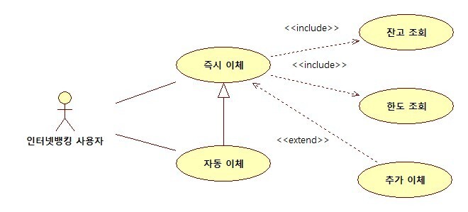 즉시 이체는 반드시 있어야 하는 기능이지만 추가 이체는 선택 사항인데, 이 경우 즉시 이체를 확장한 개념이므로 즉시 이체와 추가 이체는 확장 관계이다.