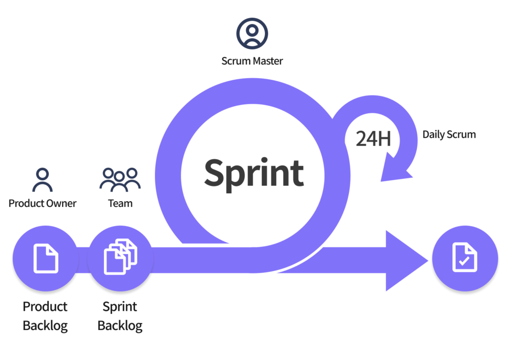 백로그는 해야할 일이고 제품 백로그 중에서 한 번의 스프린트(한 주기)동안 개발 가능하다고 생각하는 스프린트 백로그만 선택하여 스프린트 주기가 반복된다. 또한 해당 주기동안 매일 15분간 스크럼 회의가 진행된다. 이때 발언은 프로젝트를 참여하는 팀원만 가능하다.