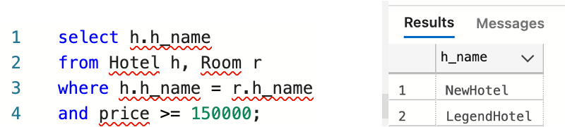 - Q1. 방 가격이 15만원 이상인 방이 있는 호텔의 이름을 나타내자