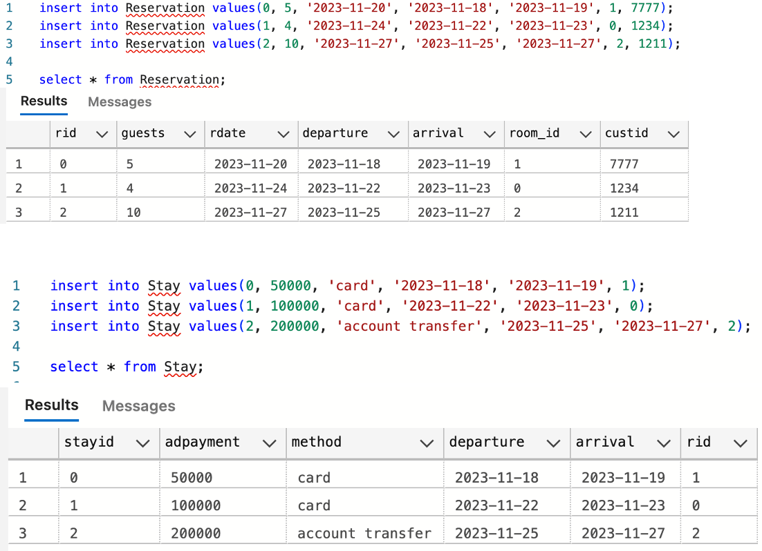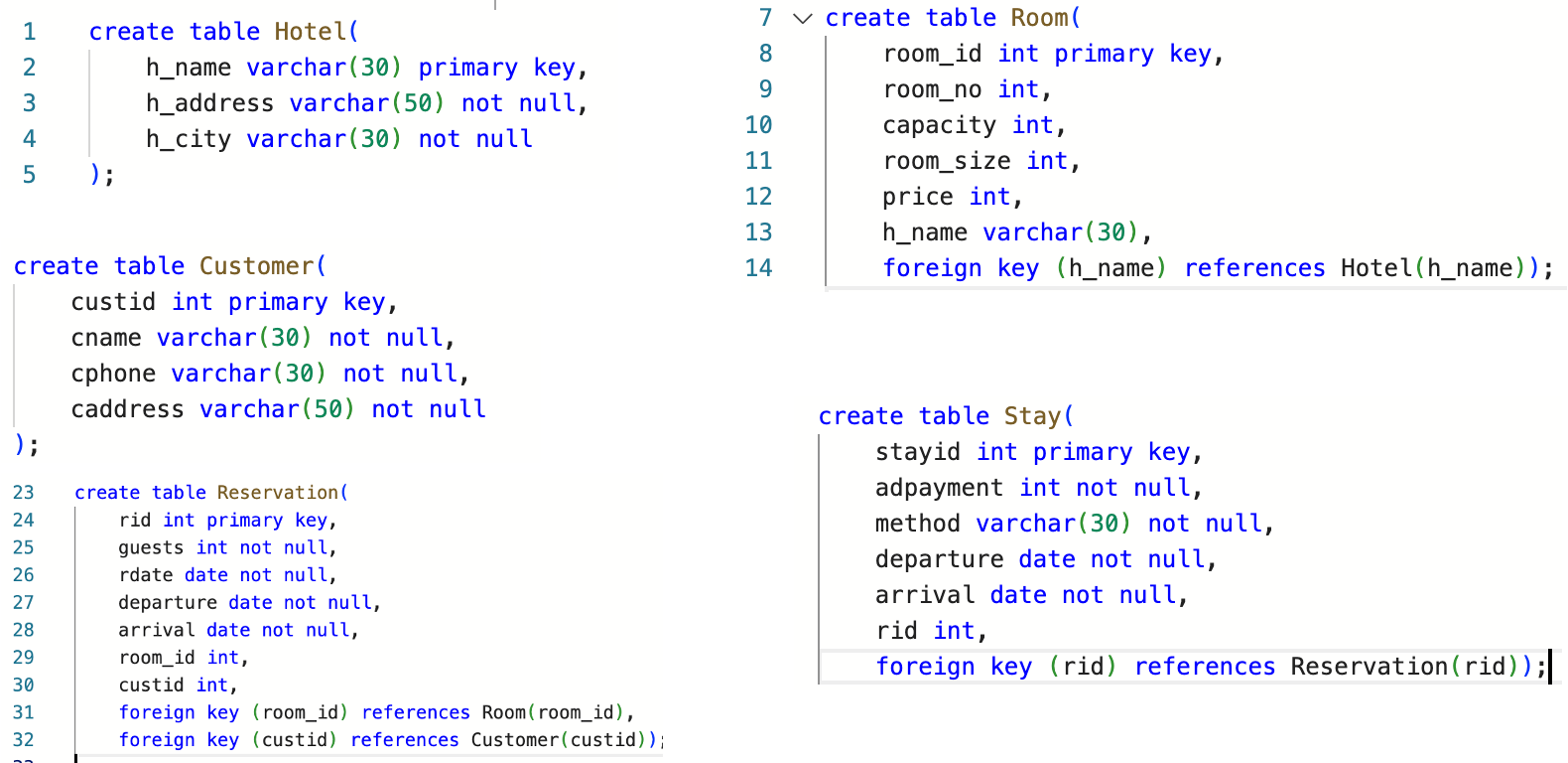 | Hotel(h_name, h_address, h_city) Room(room_id, room_no, capacity, room_size, price, h_name(FK)) Customer(custid, cname, cphone, caddress) Reservation(rid, guests, rdate, departure, arrival, room_id(FK), custid(FK)) Stay(stayid, adpayment, method, departure, arrival, reservationid(FK)) |