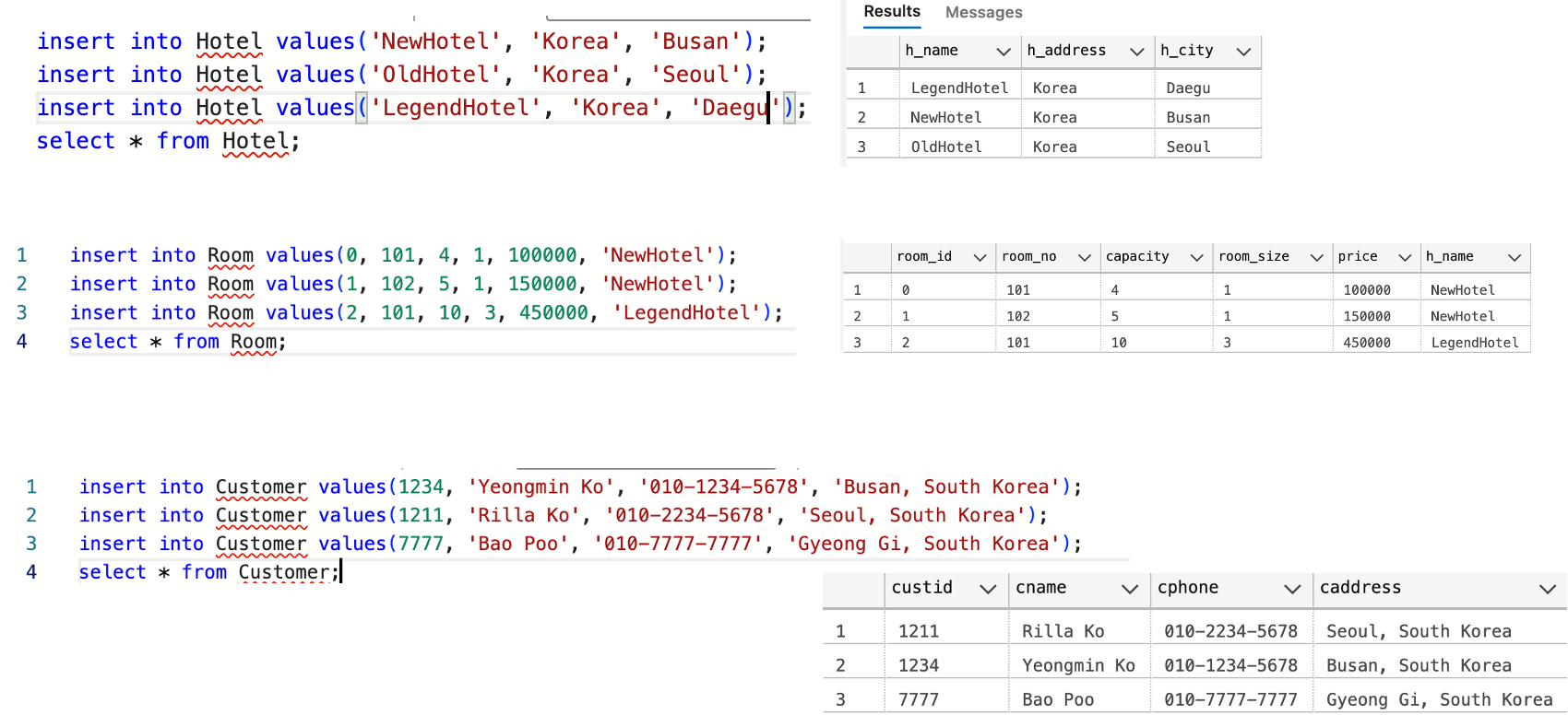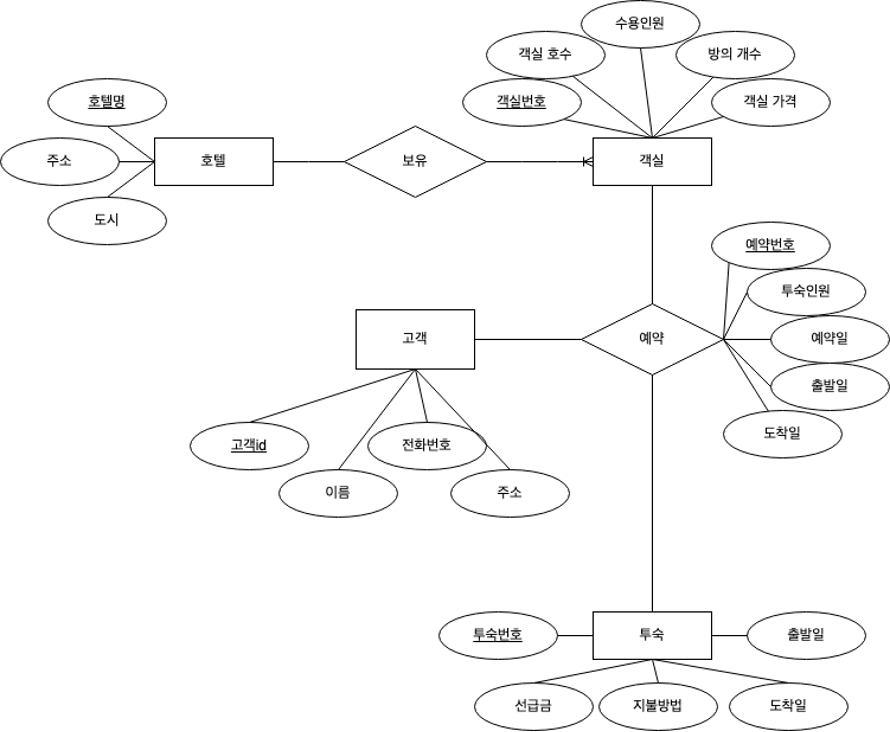 | 호텔(호텔명, 주소, 도시) 객실(객실번호, 객실호수, 수용인원, 방의 개수, 객실 가격, 호텔명(FK)) 고객(고객id, 이름, 전화번호, 주소) 예약(예약번호, 투숙인원, 예약일, 출발일, 도착일, 객실번호(FK), 고객id(FK)) 투숙(투숙번호, 선급금, 지불방법, 출발일, 도착일, 예약번호(FK)) |