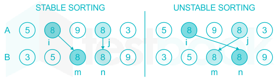 안정적인 정렬(stable sorting): 값이 같은 원소의 순서가 정렬한 후에도 유지되는 것 → i와 j의 값의 순서가 m, n이 동일