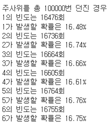 print(f'{i}가 발생할 확률은 {prob[i-1]:.2f}%')