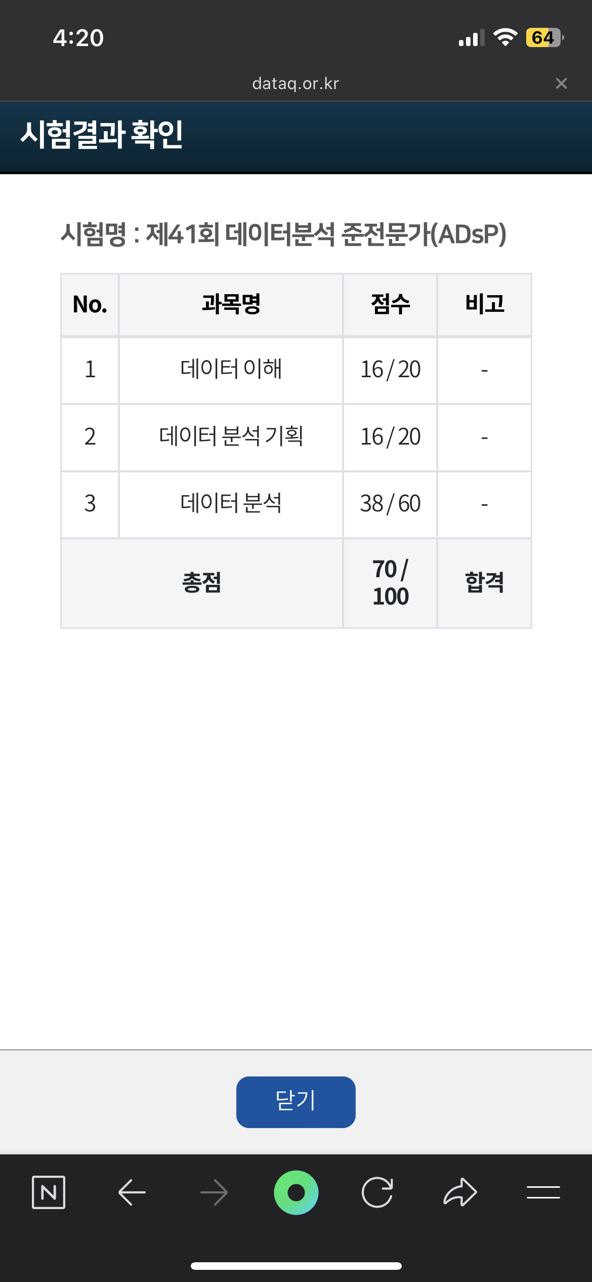 어제 제 41회 ADSP 사전 결과가 공개됐다. 필자는 전날 오후 딱 3시간만 공부하고 시험을 치러갔는데 생각보다 어려워서 60점 근처에서 턱걸이 할 줄 알았는데 다행히 70점이라는 안정적인 점수로 합격했다.