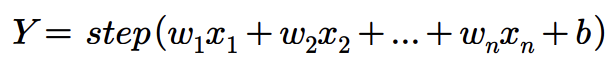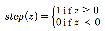 - 위 수식에서 step은 가중치 합을 입력으로 받아서 최종 출력을 결정하는 계단 함수이고, w는 가중치 벡터, 𝑥는 입력 벡터, 𝑏는 바이어스