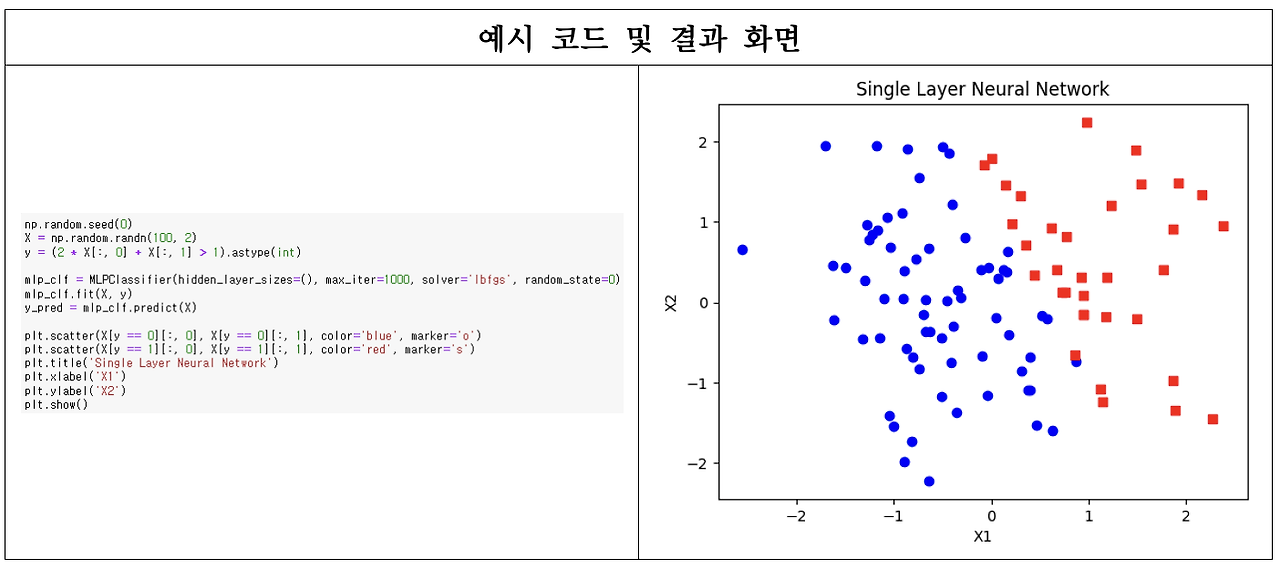 - 단일층 신경망: 입력층과 출력층으로 구성된 가장 간단한 형태의 신경망. 주로 퍼셉트론, 아데린, 로지스틱 회귀와 같은 모델들을 포함할 수 있으며, 다양한 활성화 함수를 사용할 수 있어 비선형 문제를 해결할 수 있음