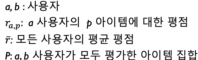 - 사용자 A와 B의 공분산을 각각의 표준편차의 곱으로 나누면 피어슨 상관계수를 구할 수 있음