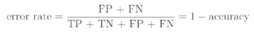 - 오분류율(Error rate): 오분류율은 1에서 정확도를 빼면 됨