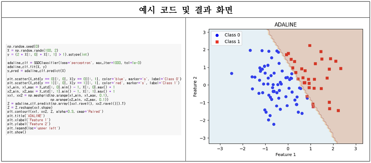 - 아달린(Adaline): 퍼셉트론과 유사하지만, 출력에 활성화 함수(계단 함수)를 적용하지 않고 선형 함수의 결과를 학습에 사용하는 것이 특징