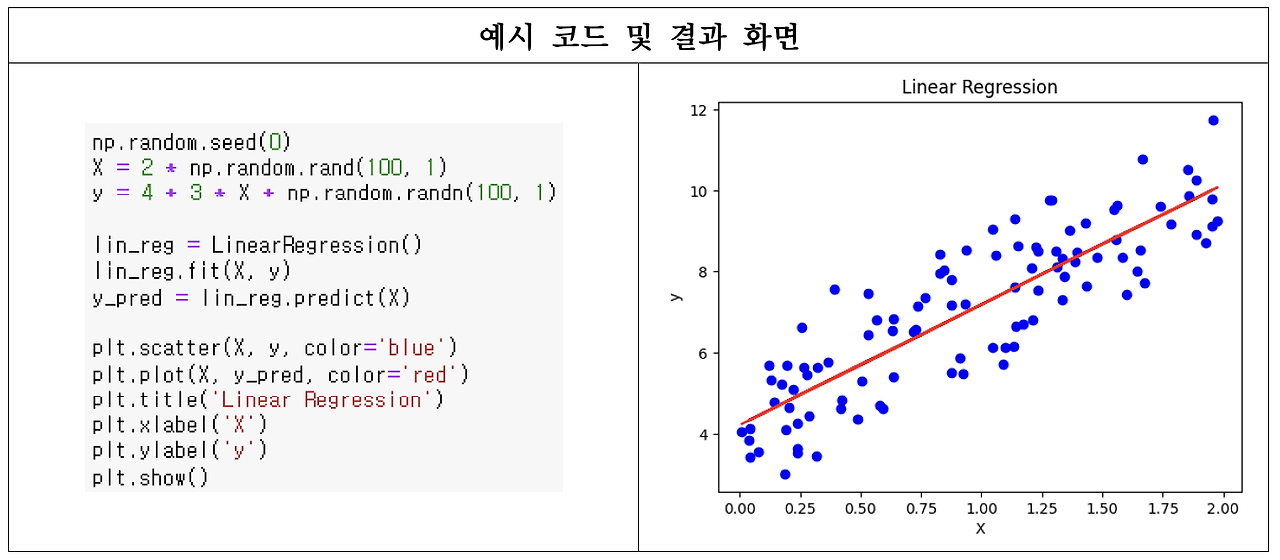 - 선형 회귀(Linear Regression): 주어진 데이터에서 독립 변수(X)와 종속 변수(Y) 간의 선형 관계를 모델링하여 연속적인 값을 예측하는 머신러닝 알고리즘(머신러닝 알고리즘이지만 인공신경망 알고리즘의 기초가 됨)