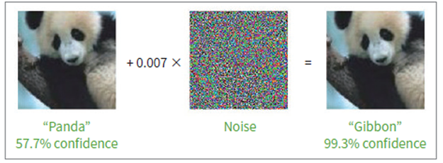 하지만, 여기에 0.007(ε) 만큼의 perturbation(일종의 noise)를 이미지에 더한다면 사람의 눈에는 알아차릴 수 없는(unnoticeable) 노이즈가 이미지에 포함되게 되고, 최종적으로 노이즈가 포함된 이미지에 대해 다시 classification을 진행했을 경우, 99.3%의 confidence를 가지고 gibbon(긴팔원숭이)라고 오분류(misclassify)를 하게 된다는 것이다.