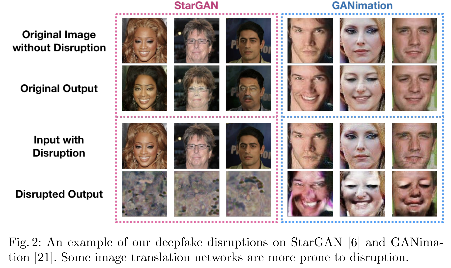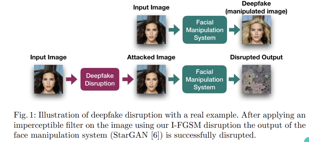 본 논문에서는 'Deepfake Disruption'이라는 새로운 분야를 제안한다. 즉, 원본 이미지에 사람 눈으로는 거의 식별이 불가능한 미세한 노이즈를 삽입하여 적대적 예제(adversarial example)를 만든다. 그리고 해당 적대적 예제를 통해 얼굴 조작(face manipulation)을 진행하면 이미지가 블러링되거나 파괴된 이미지가 출력되는 방법이다. 물론 이 연구에서는 GAN 모델에 대해서만 진행했기 때문에 약간의 아쉬움이 남는다. 차후 내 연구에서는 Diffusion 모델에도 강건하게 공격할 수 있는 Method를 제안하고 싶다.