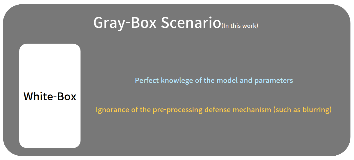 그레이박스 시나리오는 모델과 모델의 파라미터에 대해서는 완벽히 알고 있지만 방어를 위한 전처리 과정(예를 들면 블러링)에 대해서는 무시하는 것이다.