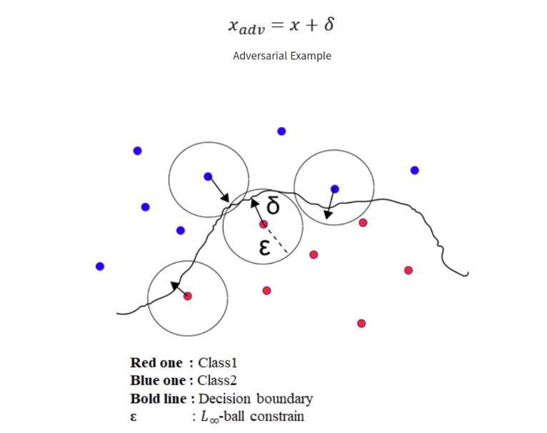 이러한 적대적 공격의 원리는 L-Norm을 활용하여 정해진 ε보다 작은 노이즈를 생성하여 적대적 예제를 만들고 이렇게 만들어진 적대적 예제는 결정 경계(decision boundary)의 범위 밖에 위치하게 되어 오분류를 이끌어 내는 것이다.