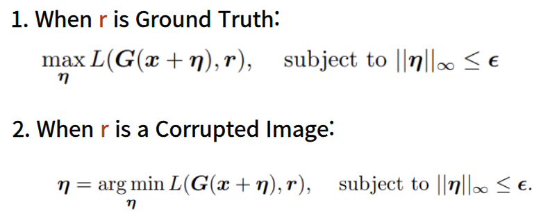 다음으로, 두 번째 수식은 targeted disruption에 관한 수식으로, r이 첫 번째 수식과 같이 정상적으로 만들어진 이미지일 수도 있으나 이미 잘못된 결과를 만들어 두고 이와 같은 결과를 유도할 수도 있는데 이에 관한 수식이다. 이 수식 또한 L-infinity norm을 적용하여 ε보다 작은 최대 크기의 η를 찾는데, 첫 번째 수식과는 반대로 적대적 예제인 G(x + η)와 r 간의 손실함수 값이 최소가 되는 η를 생성하여 최대한 이미 왜곡이 심하게 진행되어 있는 참조 이미지 r과 최대한 흡사한 결과가 출력될 수 있는 노이즈를 찾는 것이다.