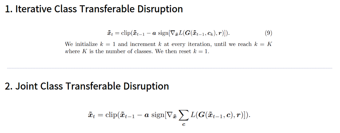 위에서 제안한 최적화 문제를 해결하기 위해서 본 논문에서는 Iterative Class Transferable Disruption과 Joint Class Transferable Disruption이라는 두 가지의 새로운 방해 방법을 제안했다.