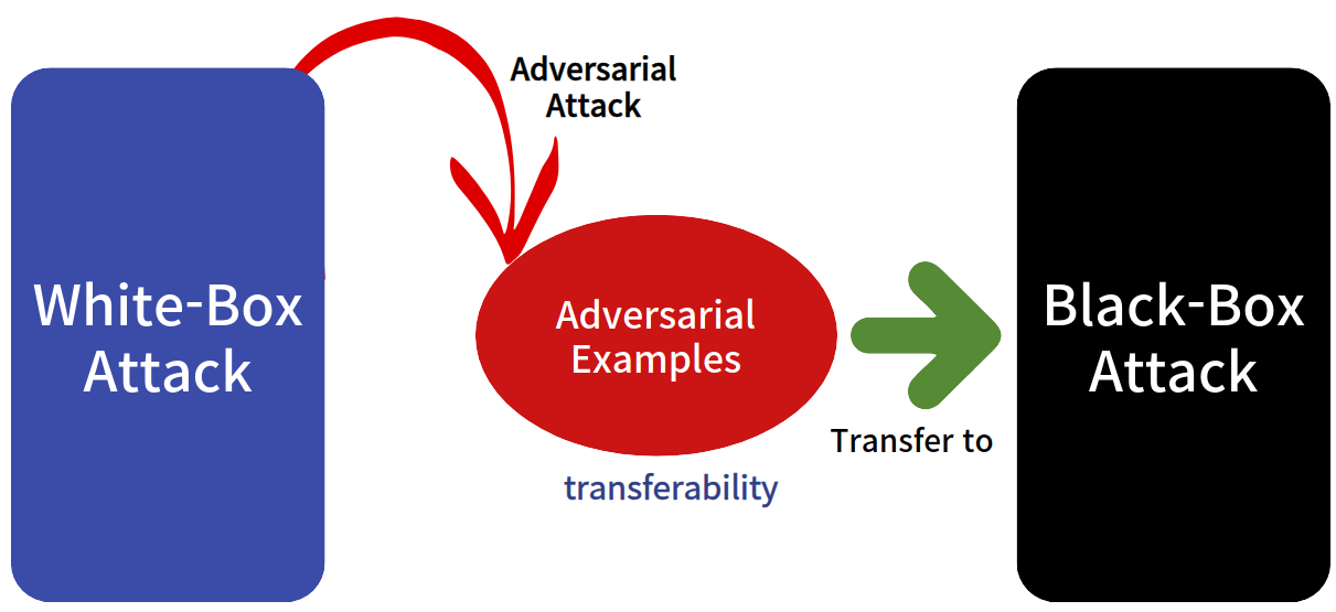 - Black-Box Attack: 공격자가 사전에 모델과 관련된 정보를 모르지만 대표적인 모델에 대해서 공격을 진행 후 adversarial example의 전이성(transferability)을 활용한 공격