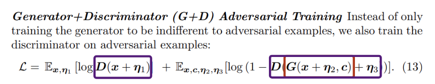 또한, 본 논문에서는 아래와 같이 생성자와 판별자 손실 각각에 대해서 노이즈를 삽입하여 각각 적대적 훈련을 진행하는 방법도 수식 (13)과 같이 제안하였다.