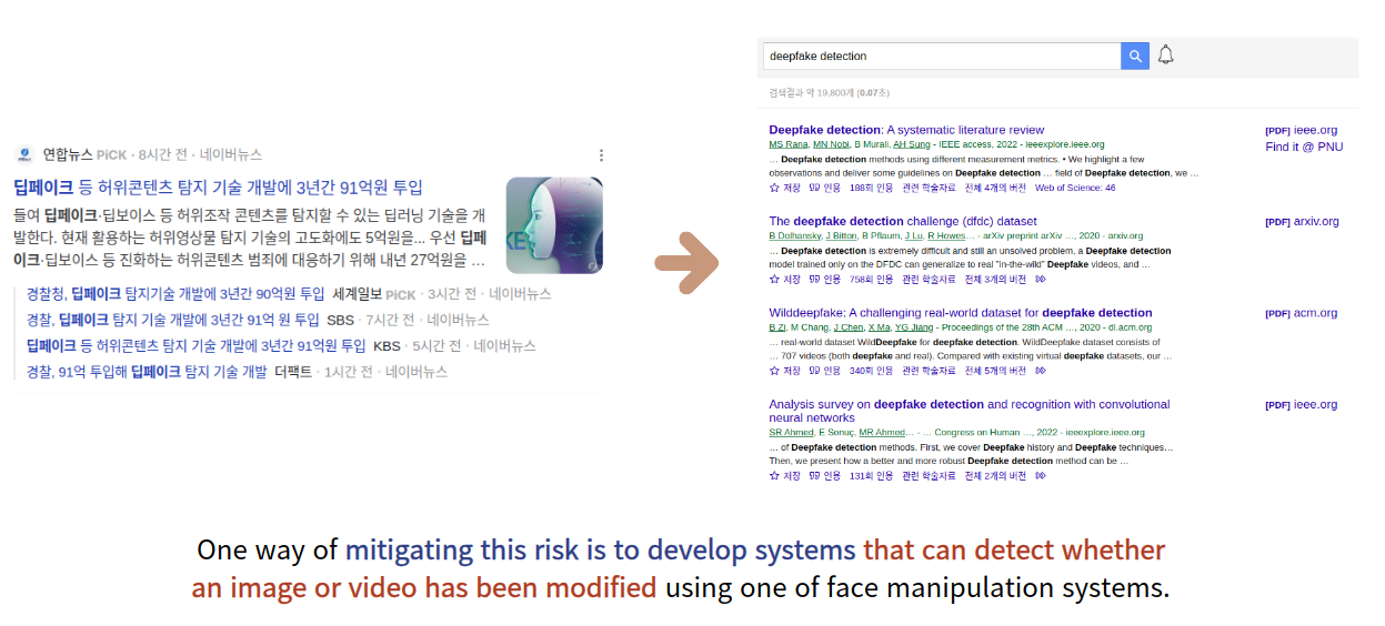 실제, 언론이나 구글 스칼라를 통해 확인해보면 deepfake detection과 관련된 여러 내용이 나온다. 이는 딥페이크 기술을 사용해 조작된 fake 이미지 혹은 영상인지 아니면 real 이미지 혹은 영상인지 감지하여 판별하는 시스템이다. 이는 가짜 뉴스 판별에는 도움이 되지만 현재 이슈가 되고 있는 딥페이크 성범죄에 대해서는 큰 실효성이 없다. 그 이유는 성범죄는 예방이 최우선 목적이 되어야하며, 이미 범죄가 발생한 후에는 피해자에게 큰 정신적 고통을 줄 수 있는 큰 문제이기 때문이다. 따라서, 애초에 딥페이크를 통해 얼굴을 조작하는 등의 기술을 원천적으로 차단하고 예방할 수 있어야 한다.