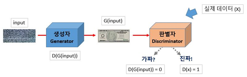 Generative Adversarial Network(GAN)는 위와 같이 두 가지 신경망인 생성자(Generator, G)와 판별자(Discriminator, D)가 서로 경쟁적으로 학습하는 구조를 갖고 있다.