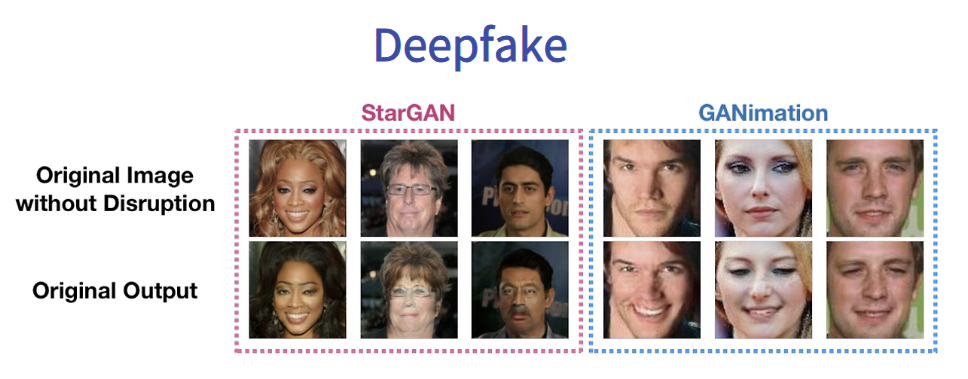 StarGAN이나 GANimation을 통해 노이즈 없이 정상적인 이미지로 딥페이크를 진행했을 때는 그림의 Original Output과 같이 정상적으로 딥페이크 결과물이 생성되는 것을 확인할 수 있다.