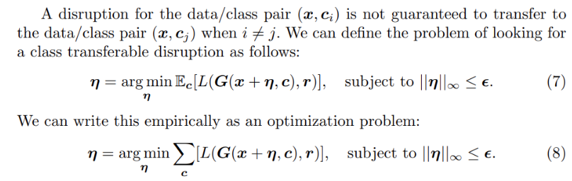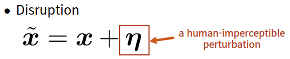 적대적 예제를 만드는 이전 연구들과 마찬가지로 이 연구에서는 disruption을 만들기 위해 아래와 같이 사람 눈으로는 식별할 수 없는 작은 노이즈(perturbation) η를 원본 이미지 x에 삽입하여 disrupted image x~(x tilda)를 생성한다. 수식으로는 다음과 같다.