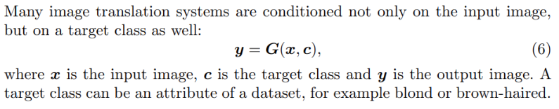 본 논문에서는 많은 이미지 변환 시스템의 경우 입력 이미지뿐만 아니라 대상 클래스에 대해서도 조건화과 된다고 하며, y = G(x, c)와 같이 나타낼 수 있다고 한다. 이때 x는 입력 이미지이고, c는 대상 클래스, y는 출력 이미지를 뜻한다고 한다.