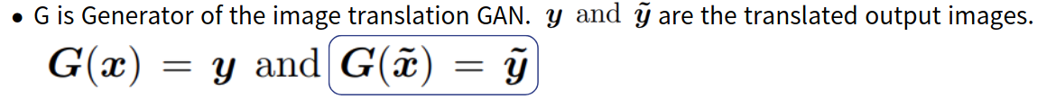 G를 이미지 변환을 위한 GAN의 생성자라고 하고 y와 y~를 각각 x와 x~를 통해 만들어진 변환된 결과 이미지라고 하면 수식으로는 다음과 나타낼 수 있다.
