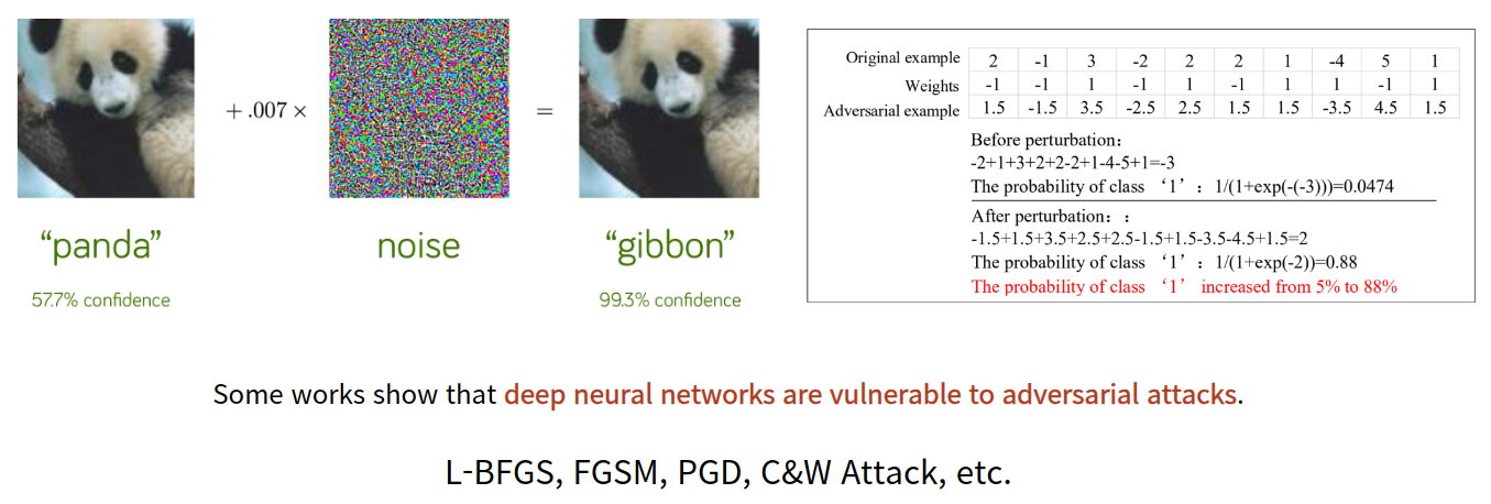 위 그림은 Adversarial Attack을 한번에 정리하여 나타낸 그림이다. 어떤 모델이 있고, 그 모델은 그림의 좌측과 같이 판다 이미지에 대해서 57.7%의 confidence를 갖고 판다로 예측하는 모델에 아주 미세한 노이즈(0.007 만큼 곱한 아주 작은 노이즈)를 원본 이미지에 삽입하면 그림의 중앙에 위치하는 적대적 예제(adversarial example)가 만들어지고, 이는 모델이 99.3%의 confidence를 갖고 긴팔원숭이(gibbon)이라고 오분류(misclassify)를 이끌어낸다. 이렇게 오분류를 이끌어내는 task를 적대적 공격(adversarial attack)이라고 한다.