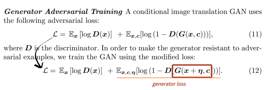본 논문에서는 생성자가 적대적 예제에 대한 저항성을 갖도록 하기 위해 수식 (12)와 같이 기존의 판별자 손실 함수를 변형하여 생성자 손실 함수 부분에 노이즈 η를 포함하여 함께 학습하도록 진행하였다.