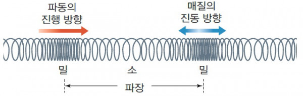 위 그림에서 알 수 있듯이, 매질의 간격이 밀집된 곳을 '밀'이라 하고 듬성듬성한 곳을 '소'라고 하며 밀에서 밀까지 혹은 소에서 소까지의 거리를 '파장'이라고 한다.