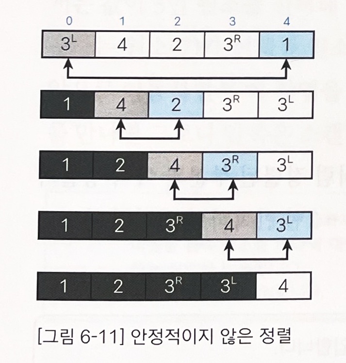 이 배열은 정렬한 후 두 원소(3L, 3R)의 순서가 바뀌었음을 확인할 수 있음