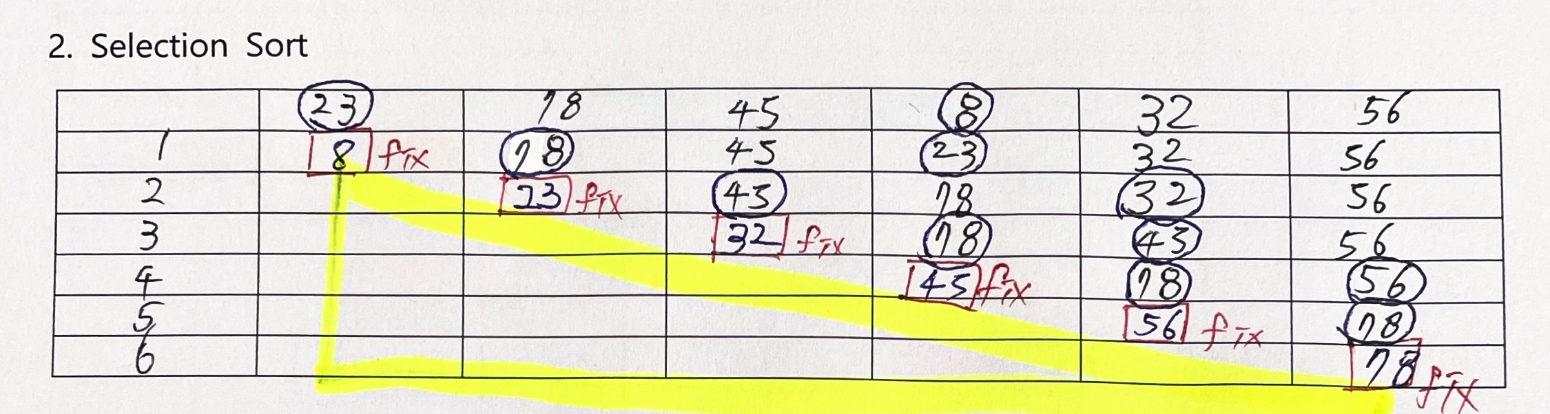 총 6번의 과정을 진행하며 매 과정에서 정렬되지 않은 원소 부분에서 최솟값을 선택해 맨 앞에 있는 원소와 교환하는 것을 반복하는 것을 확인할 수 있고, 최종적으로 fix된 데이터들을 형광펜으로 이어보면 삼각형 모양이 나타남을 확인할 수 있다.