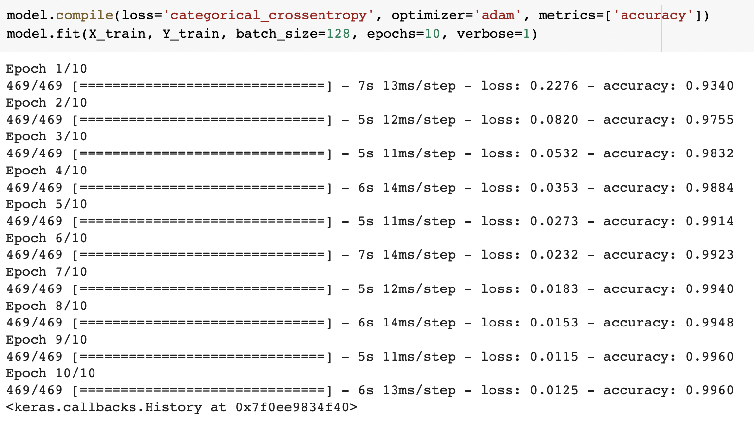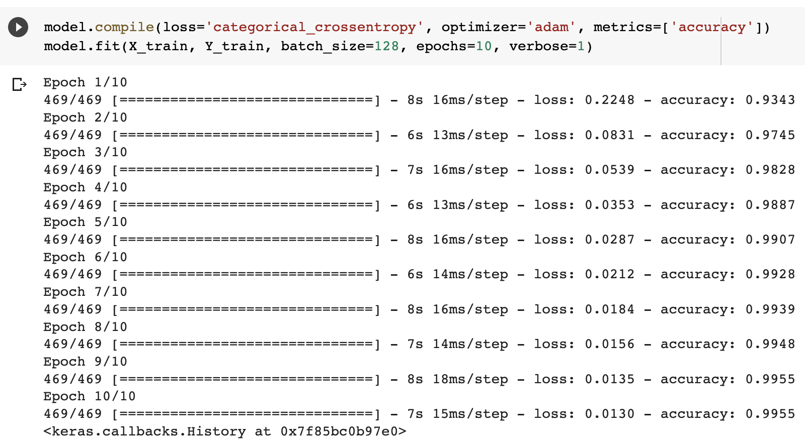 · model.fit(X_train, Y_train, batch_size=128, epochs=10, verbose=1)