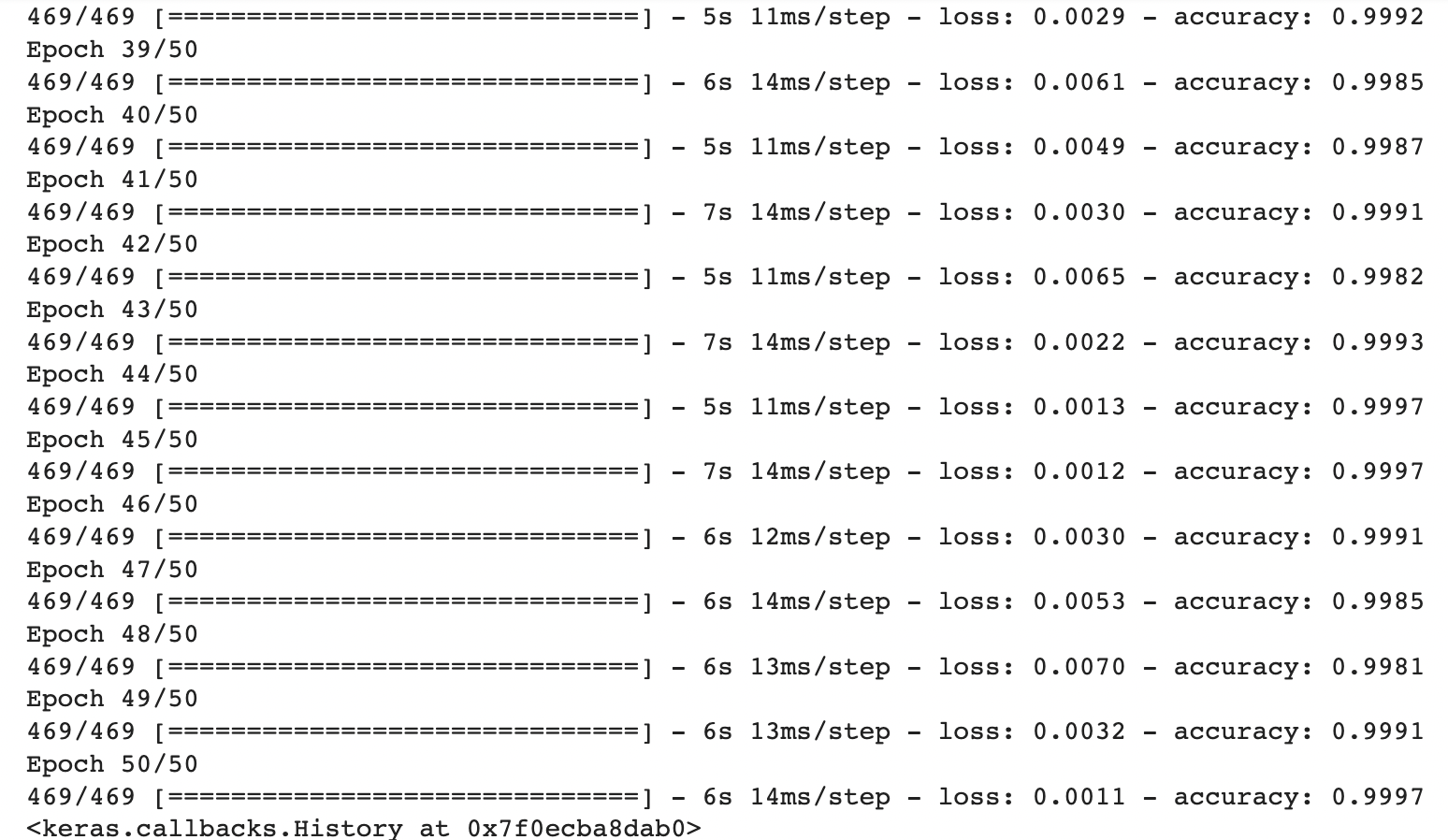 첫 번째 epoch부터 10번째 epoch로 갈수록 오차값(loss)이 줄어드는 모습과 정확도(accuracy) 또한 증가하는 것을 볼 수 있음