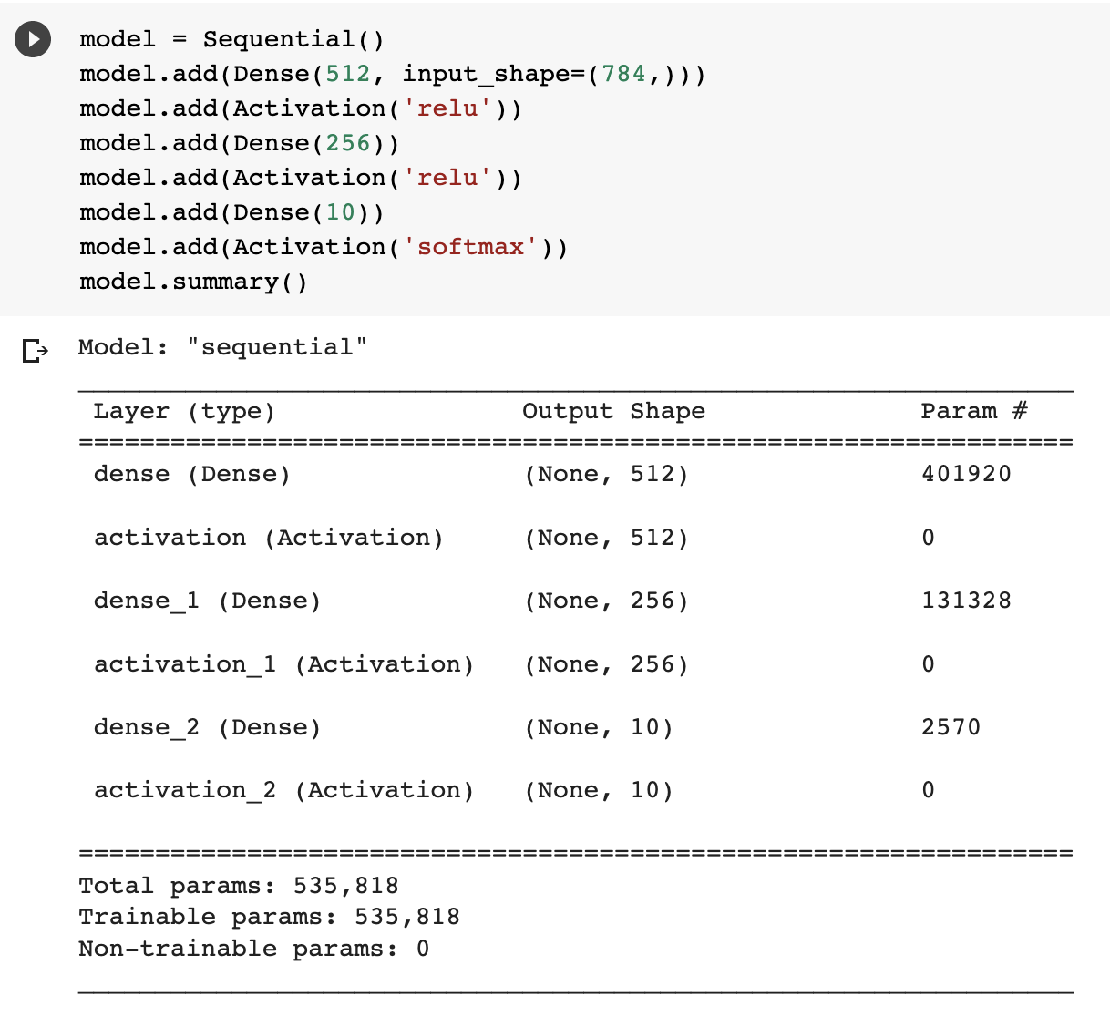 2. 첫 번째 레이어는 512개의 노드로 이루어져 있으며 총 401,920(784*512+512)개의 파라미터로 이루어져 있음