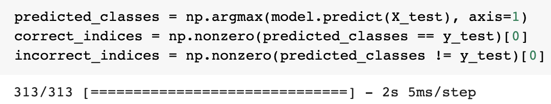 · correct_indices = np.nonzero(predicted_classes == y_test)[0]