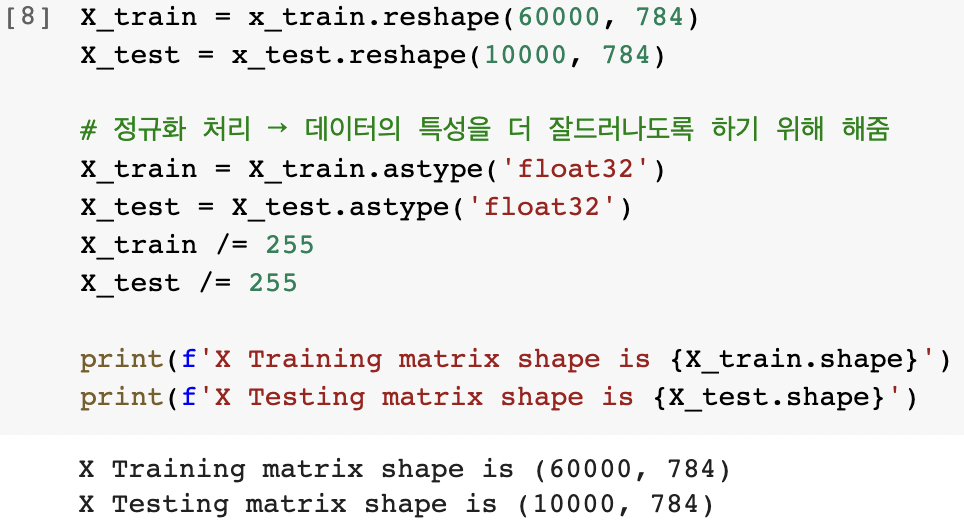 · X_train = x_train.reshape(60000, 784) &X_test = x_test.reshape(10000, 784)